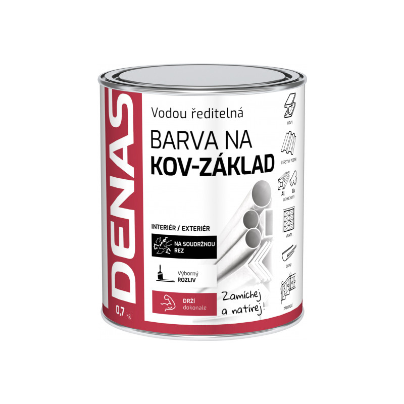 DENAS NA KOV-ZÁKLAD základní antikorozní ochrana železa, hliníku, mědi, pozinku. DENAS základní antikorozní barva na kov (dříve DENAS ANTIKOR) je vodou ředitelná barva pro nové i renovační nátěry se zvýšenou korozní ochranou. Barva je vhodná k nátěrům ocelových, železných, hliníkových i čerstvě pozinkovaných konstrukcí a plechů, plechových střech, jejich klempířských prvků, zábradlí, plotů, sloupů a dalších kovových výrobků umístěných v exteriéru i interiéru. Je vhodná také na čerstvou měď. Vykazuje velmi rychlé zasychání, výbornou přilnavost na kovových podkladech, kryvost i zpracovatelnost.