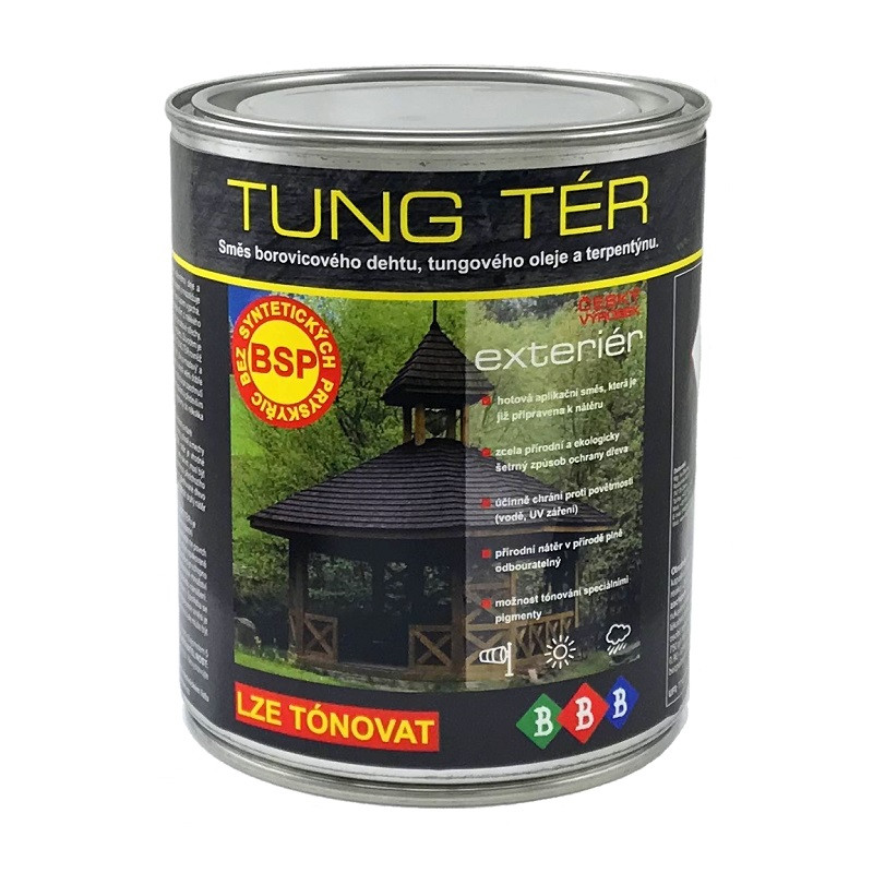 POPIS: BBB TUNG TÉR je připravenou aplikační směsí čistých přírodních produktů – borovicového dehtu, tungového (čínského dřevného) oleje a terpentýnového oleje. TUNG TÉR po zaschnutí neuvolňuje nebezpečné látky, je v přírodě plně odbouratelný a nezatěžuje životní prostředí. Jedná se o kapalinu tmavohnědé barvy s charakteristickým kouřovým zápachem, který časem vyprchá. Je určen pro použití v exteriéru.
